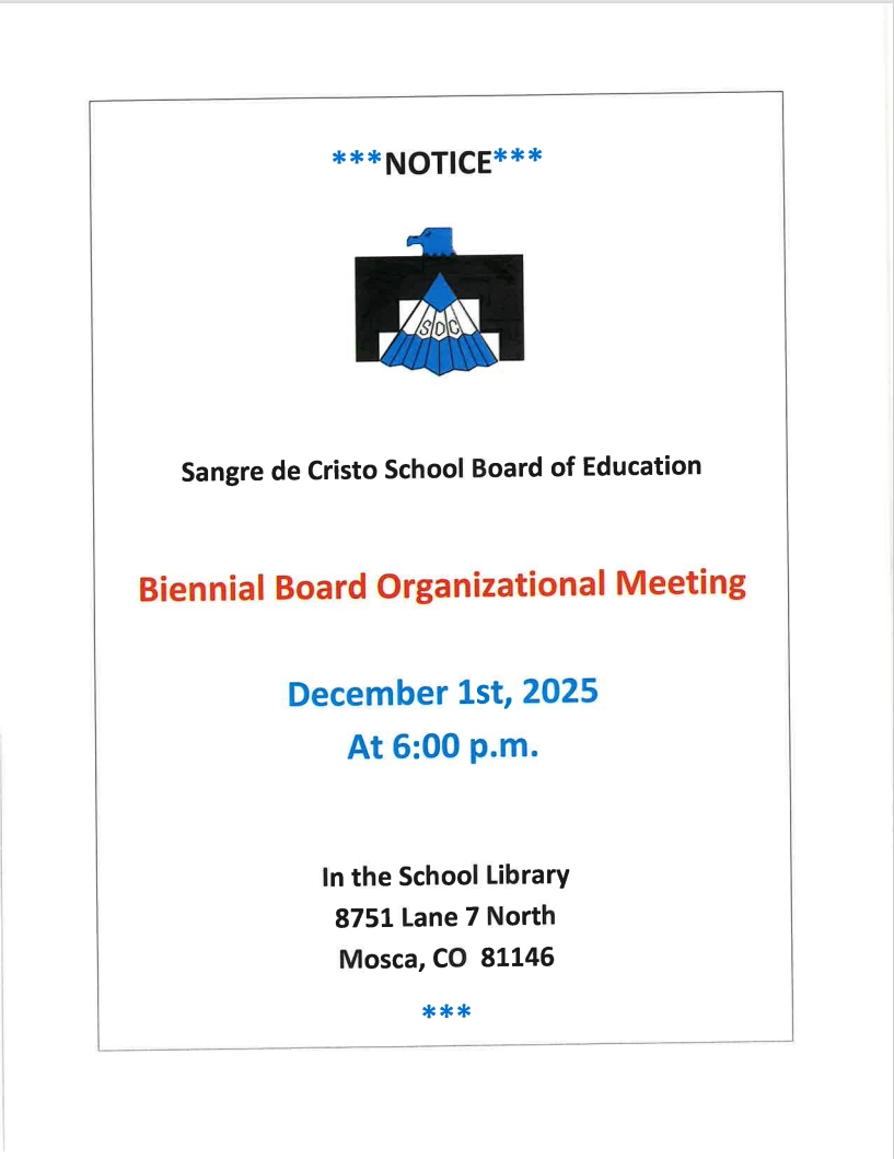 The Sangre de Cristo School District shall strive to provide a safe environment for all students and staff while offering meaningful opportunities of innovative educational programs for all students which challenge every student to: